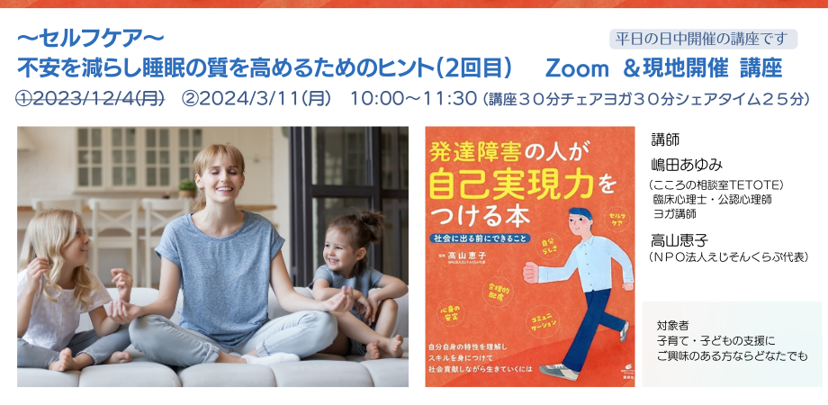 今回の講座では、気持ちの中でも付き合い方が難しい気持ち「不安」、また、わたしたちの暮らしの土台となる「睡眠」をテーマに取り上げていきます。身体や気持ちを整えるセルフケアは、巡り巡ってこどもたちのケアにもつながっていきます。身体と気持ちに関するお話と、チェアヨガを通した体験の時間を作っていきます。